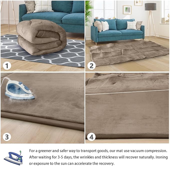 - šHOW TO CARE FOR YOUR MAT:When you open the package,it may be wrinkled,very flat and inelastic.Don't fret - this is normal! As long as it is left for 3-5 days, the mat will naturally regain its thickness and elasticity. we recommend steaming or ironing it to speed up recovery. After you have completed the steaming/ironing, your thick floor padded mat should rebound and be ready to use!