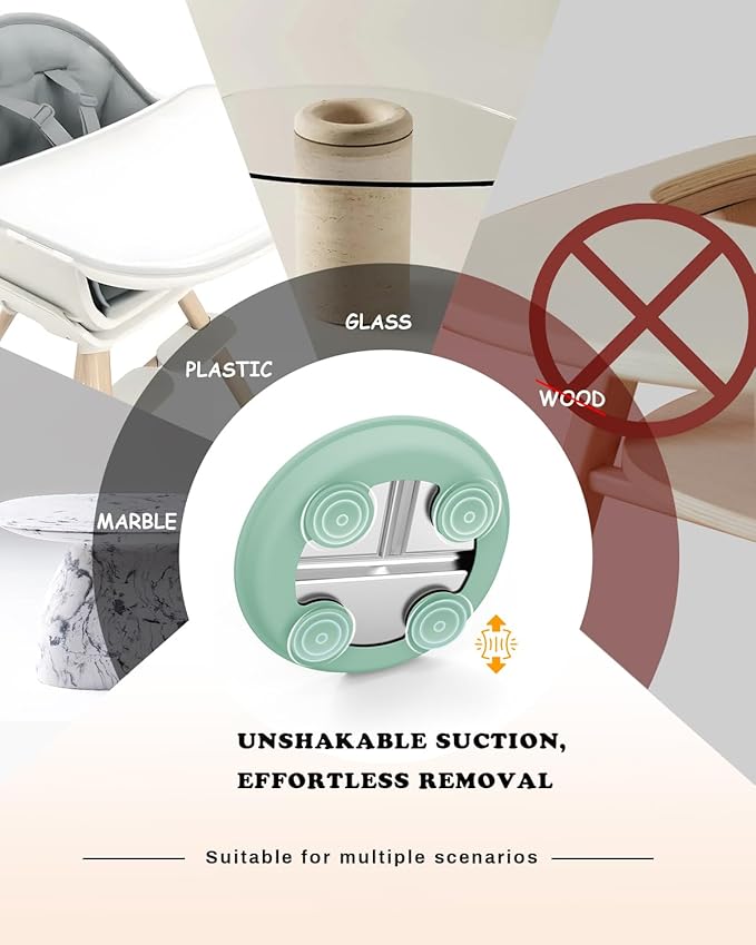 - Innovative Design: This baby plate with suction combines durable 304 stainless steel with a silicone suction base featuring 4 strong, non-slip suction cups. Keeps plates in place on highchair trays or tables, helping your child self-feed and minimizing mealtime mess. Say goodbye to flipped toddler plates and hello to free hands for mom!