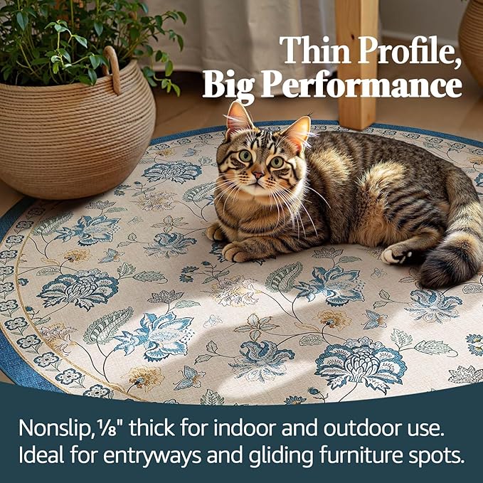 jinchan 7ft Floral Round Rug for Dining Room Washable Living Room Rug Vintage Romance Design Non Slip Indoor Floor Cover Lightweight Low-Profile Throw Carpet for Bedroom Porch Patio, Blue/Beige