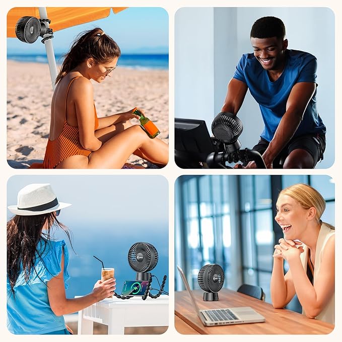 - 【Baby-Safe Design】The baby fan for stroller features <5mm finger-safe gaps in the fan cover, a food-grade silicone tripod that's safe for baby's touch, a removable front cover for easy cleaning, and upgraded circuit protection for safe use even while charging.