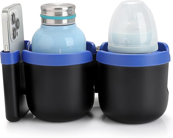 - This 2-in-1 stroller cup holder with a phone holder, it can load drinks bottles and cell phone at the same time. You can see new messages, incoming calls in the first time when you are pushing a stroller or running on a treadmill. It is applicable to most cell phones on the market.