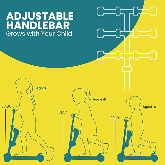 - Grows with Your Child – The adjustable T-bar handlebar offers four height settings (26.77’’, 29.13’’, 31.5’’, and 33.86’’ inches), making this kids 3 wheel scooter the perfect ride for toddlers as young as 2 years old weighing up to 165 lbs.