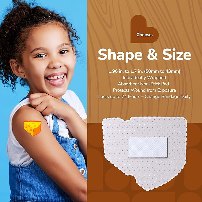- EASY TO CARRY AND USE: These cute and colorful Cheese children's bandages are easy to take with you for travel, and easy to store in a home first aid kit; these healing bandages are perfect for school, summer camp, camping trips, weekend getaways and more
