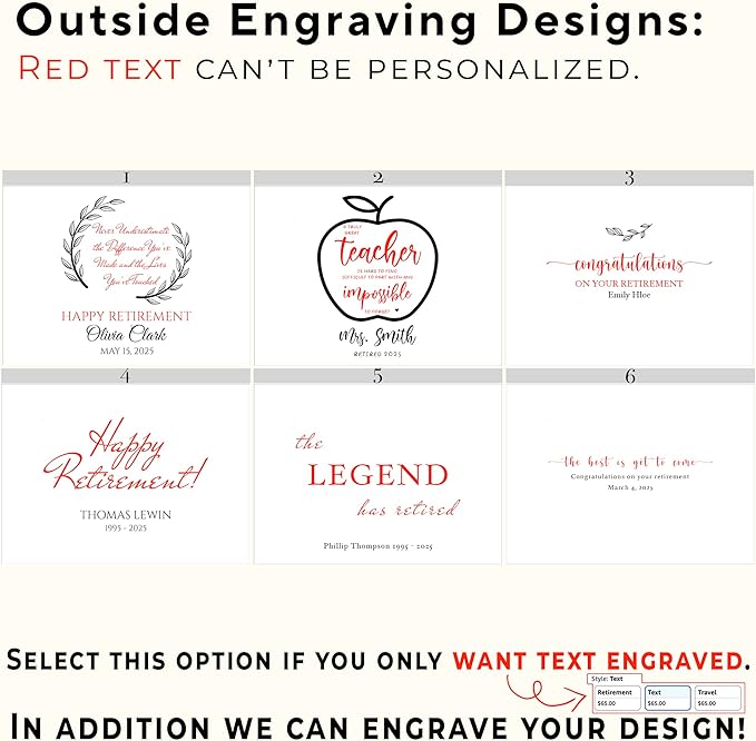 - Customizable: this acacia retirement box for memories can be engraved with various designs offered adding the name, retired date to make it unique. We’ll use the font style showcased in the photos. Additionally, it can be engraved inside(different font options), on the other lid's side, to create a surprise message for the recipient