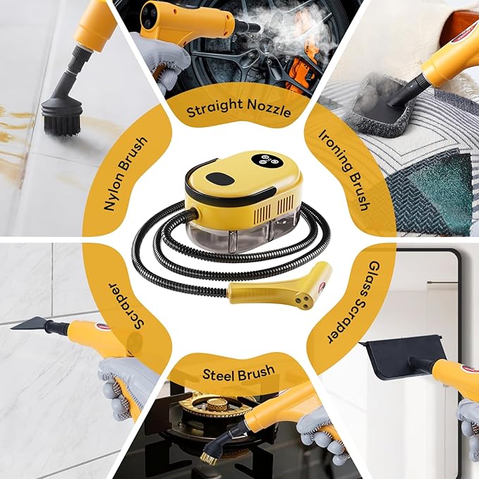 - Includes 18 Accessories and Storage bag: Equipped with nylon brushes, brass brushes, angled nozzles, glass brushes, scrapers, gloves, rags, and more. Also comes with a matching storage bag, making it convenient for storing and organizing each cleaning session.