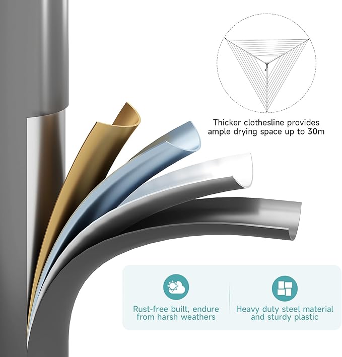 - Premium Quality: The umbrella clothesline is made of steel with a plastic ground socket for complete assembly. The surface is spray-coated, which makes it not easy to rust and greatly prolongs its service life.