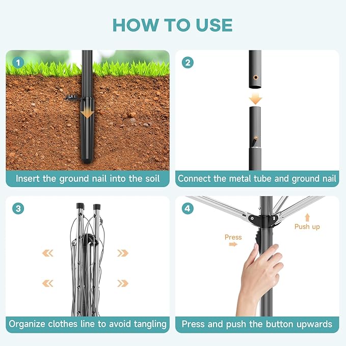 - Easy Ground Installation: Securely anchor this outdoor drying rack with the durable ground stake system, the deep-rooted stake and anti-tilt base prevent wobbling, perfect for lawns, patios, or gardens. Easily assemble in minutes.