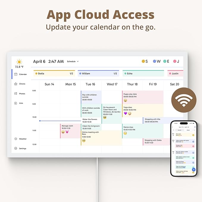 - 【Manage from Anywhere】: Stay connected with the powerful eCalendar App. Access and manage your calendar on the go, with free features like a photo frame, chore chart, dinner plan, grocery list, and more. Paid functions like Magic Import offer advanced tools tailored for users with special needs.