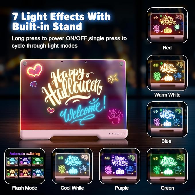 - [Versatile LED Drawing Board]-: Transform your artwork with vibrant neon colors! Switch between 7 different light modes to create captivating and unique glowing effects. It can also be used as a message board, drawing board, or a night light as room decor