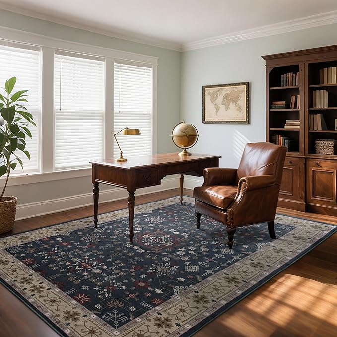 6x9 Washable Blue Area Rug for Living Room Bedroom, Boho Dining Room Rugs for Under Table, Large Low Pile Non-Slip Vintage Print Carpets for Farmhouse, Office, Dorm