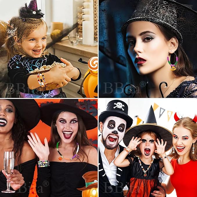 - [ Large Quantity ]: Total about 2088pcs, include halloween polymer clay beads ,5 colors flat clay beads,5 colors pearl beads,white letter beads, black letter beads,gold B&O letter beads,6 Halloween metal pendants, in 3 colors large skull beads,1 color pumpkin bead,4 Earhook and Earring,1roll 5m elastic string.