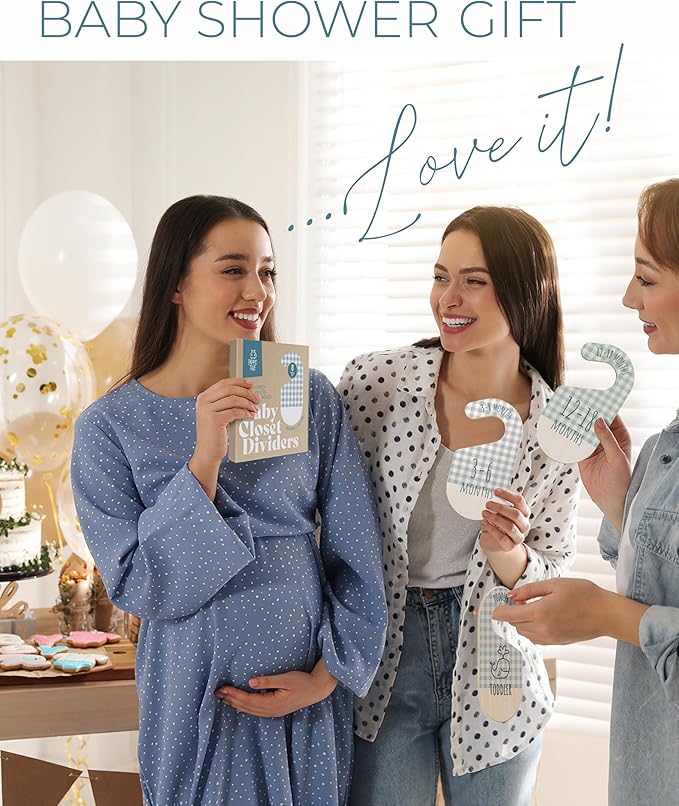 - COMPLETE SET OF BABY ORGANIZERS & STORAGE: Includes 8 beautifully crafted wooden closet dividers in soft blue gingham patterns and a sleek, minimalistic gift box. Perfect not only for sorting baby clothes from newborn to toddler sizes but also as baby room decor.