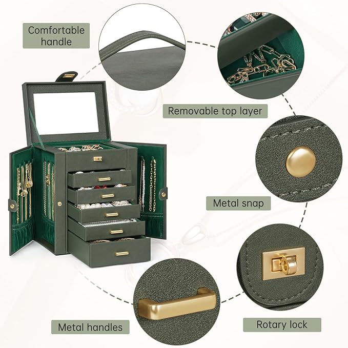 - Large Mirror Grab-and-Go Handle, This mirrored jewelry box comes with a built-in large mirror on top lid, making it easier to dress yourself. The lid has a ribbon attached to keep it from falling back. With a grab-and-go handle, convenient to carry around; delicate buckle for one-hand easy opening, easy to use and saving your time