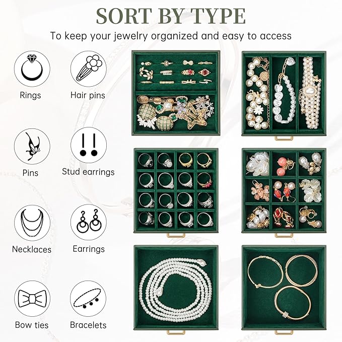 - LARGE CAPACITY, With 6 versatile pull out drawers, this black jewelry box can store a lot of jewelry accessories, such as rings, earrings, necklaces, chains, bracelets, and so on. Soft pillows in the bottom drawer suit for storing watches. One deeper drawer is designed for sunglasses or large jewelries