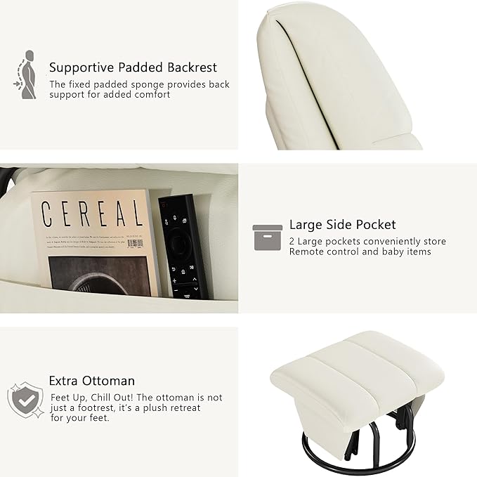AODAILIHB Swivel Glider Recliner with Ottoman, 360 Rocking Chair with Foot Rest Recliner Chair Indoor Rocking Chair with Side Pockets Nursery Chairs for Living Room, Bedroom, Office (White)