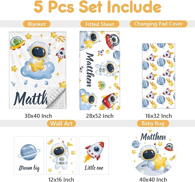 - Complete Set: This customized baby bedding set includes a double layer dotted backing blanket, crib sheet, changing pad cover, baby rug and wall arts, designed to add style and comfort to your nursery. The dotted backing of the double-layer blanket will be adored by your little one.