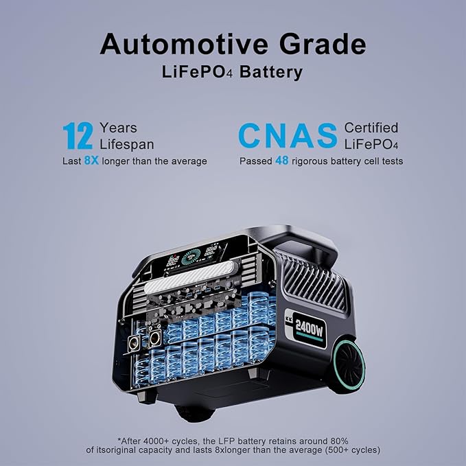 - 【Premium LiFePO4 Battery for Long-Term Use】Equipped with high-quality LiFePO4 (lithium iron phosphate) batteries, the power station offers over 4,000 charge-discharge cycles and a lifespan of up to 15 years. Compared to traditional batteries, it delivers up to 7 times longer life and greater cost efficiency. Built-in Battery Management System (BMS) and Micro Control Unit (MCU) help monitor voltage and temperature to ensure stable, safe operation.