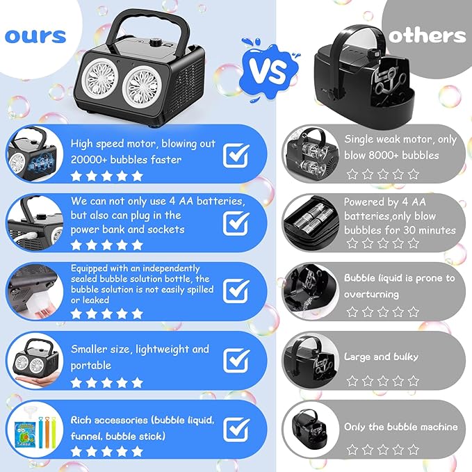 - 🌈Diverse Usage Scenarios:Whether it's family entertainment, birthday parties, outdoor picnics, kindergarten activities, commercial activities, etc., this bubble machine can be perfectly adapted, adding joy and a dreamy atmosphere to different scenarios, allowing you to enjoy the fun of bubbles anytime and anywhere.